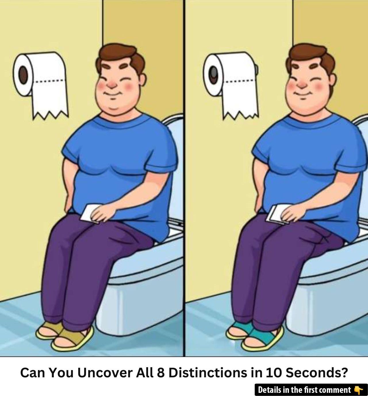 Here’s a pair of nearly identical illustrations—one subtle detail changed eight times. Your mission: spot all 8 differences between the two men sitting on a toilet before time runs out! Think you’ve got eagle‐eyes? Give it 10 seconds and see how many you can name.