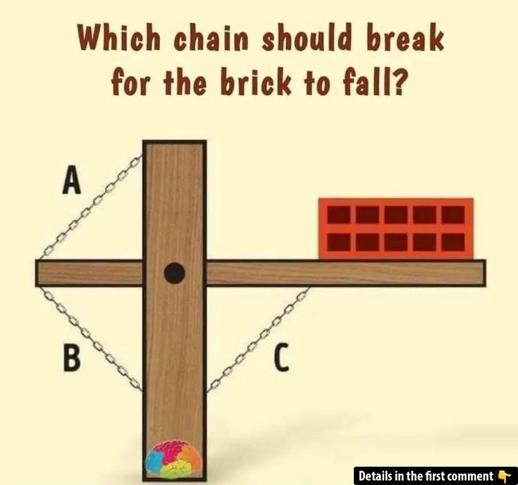 At first glance, this puzzle looks straightforward: a wooden beam extends from a central post, with a brick resting on one side. Three chains—A, B, and C—support the beam. Yet only one of these chains, when removed, will cause the brick to fall. Which one is it? Before scrolling further, take a moment to form your own hypothesis. Is it chain A, B, or C?